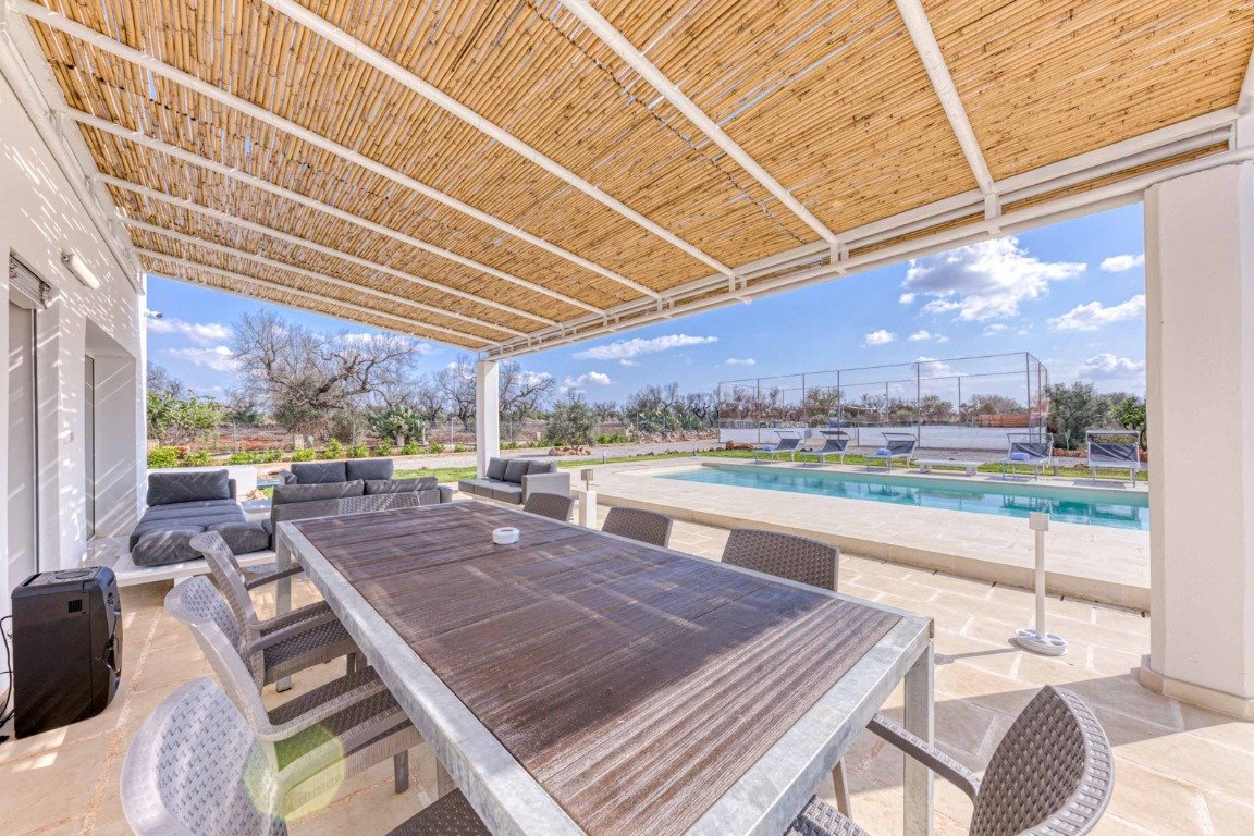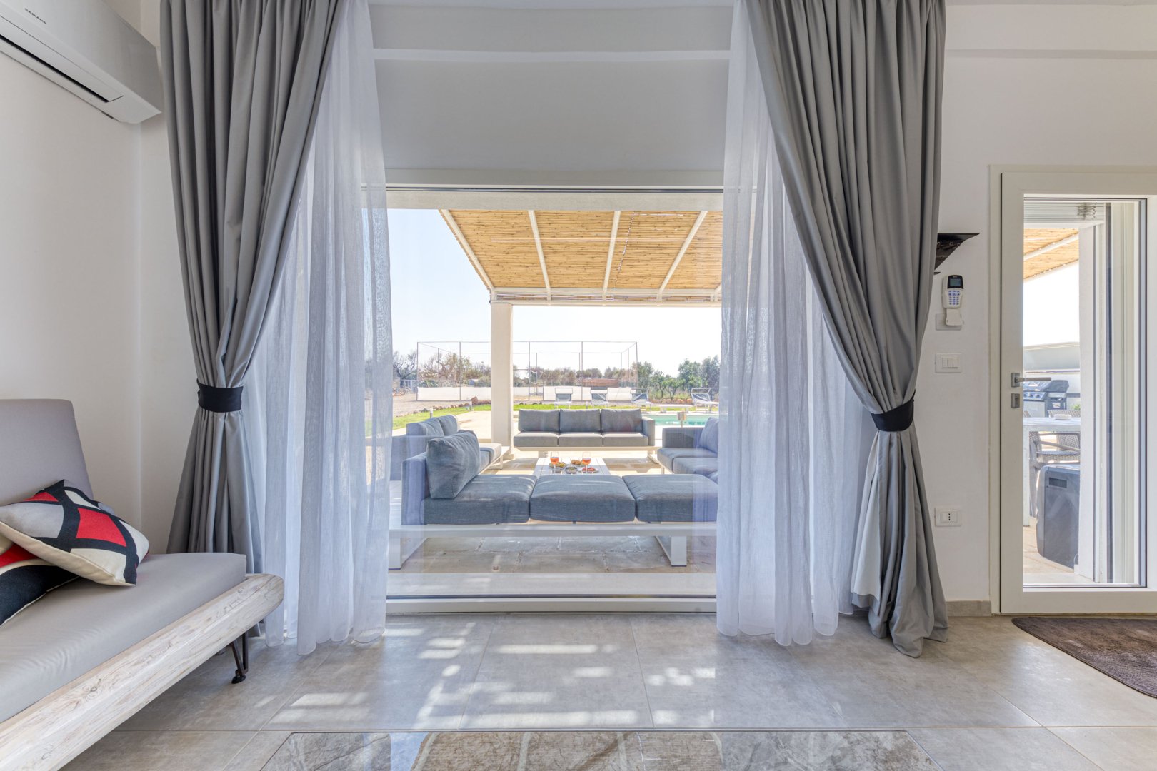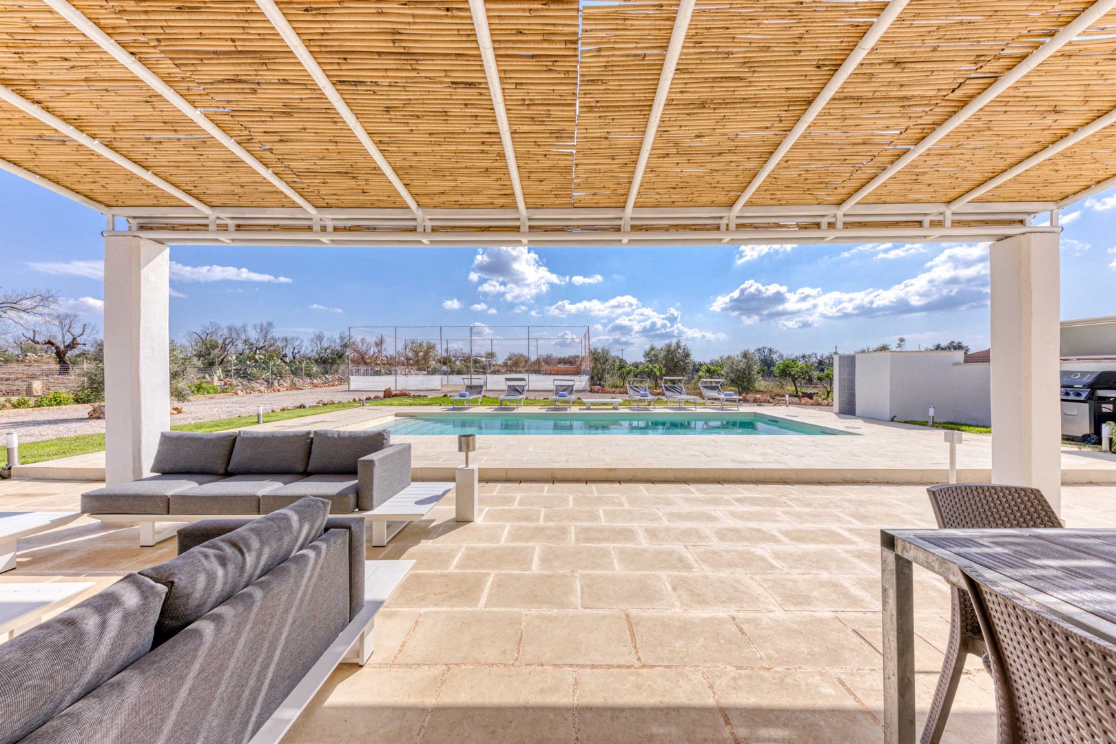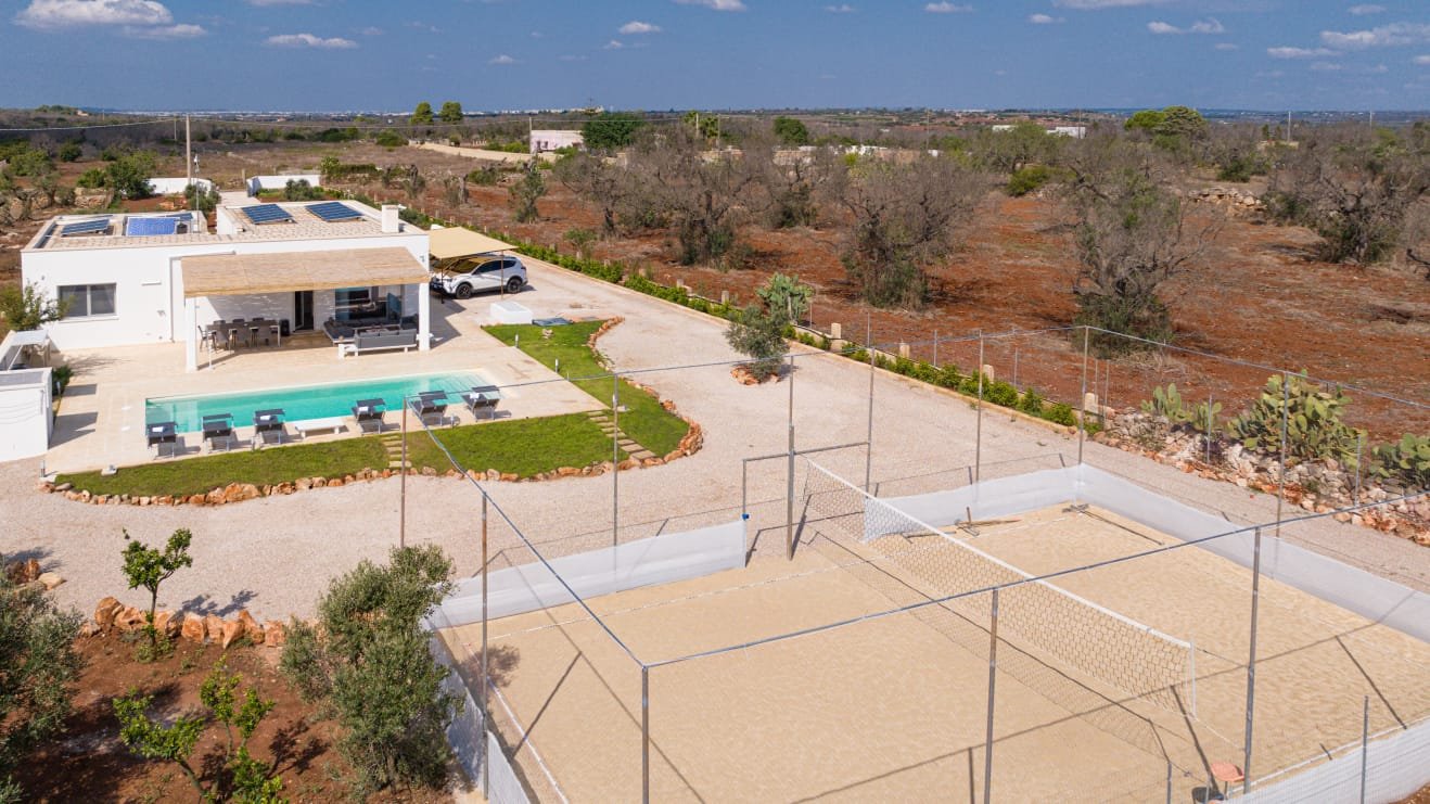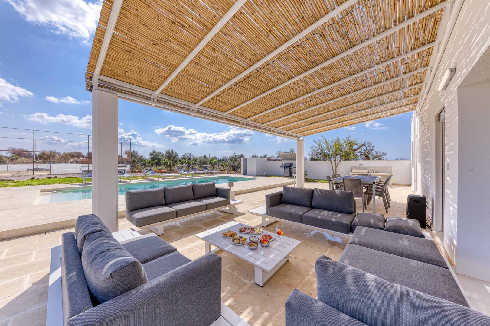 All'esterno troviamo una splendida piscina, living con divani e tavolo esterno, doccia esterna, barbecue, parcheggio all'ombra, campo da beach tennis-volley, area relax....